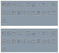 <head> <meta charset="UTF-8"> <title>Document</title> <style> body{ font: 110%/1.6 Baskerville, Palatino, serif; /*字體過小表現不出樣式*/ } .wrap{ width: 200px; background: hsl(210, 13%, 60%); color: hsl(210, 13%, 30%); padding: .1em; text-shadow: 0 1px 1px hsla(0, 0%, 100%, .8); } .wrap02{ margin-top: 10px; width: 200px; background: hsl(210, 13%, 60%); color: hsl(210, 13%, 30%); padding: .1em; text-shadow: 0 -1px 1px hsla(0, 0%, 100%, .8); } </style> </head> <body> <div class="wrap"> <span>根據協議,四?。ㄊ校⑸罨逃C合改革合作交流.</span> </div> <div class="wrap02"> <span>根據協議,四省(市)將深化教育綜合改革合作交流.</span> </div> </body>